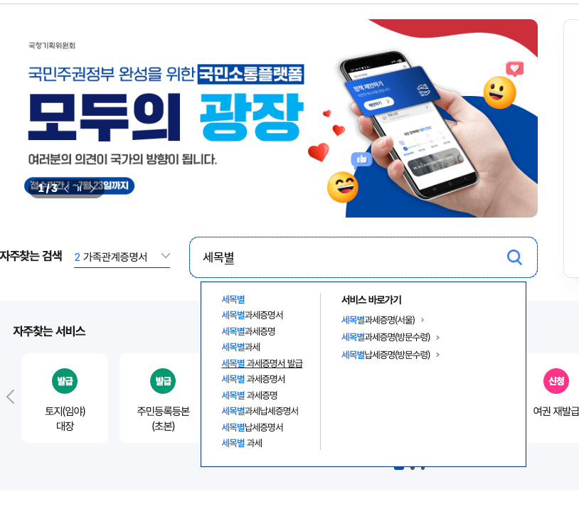 → https://www.gov.kr 접속 후, 검색창에 세목별 과세증명서 입력